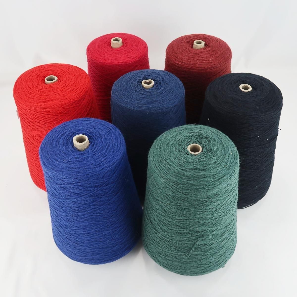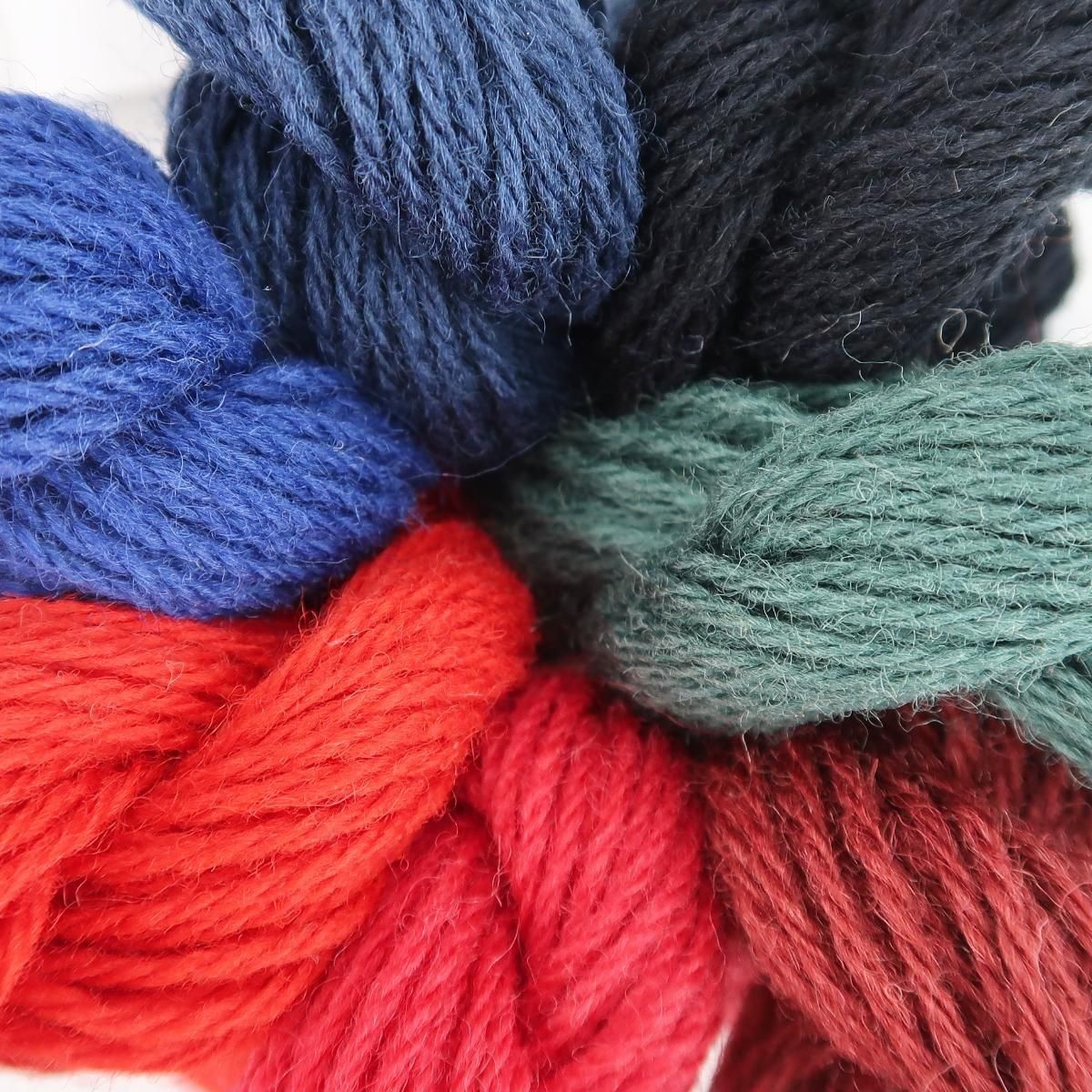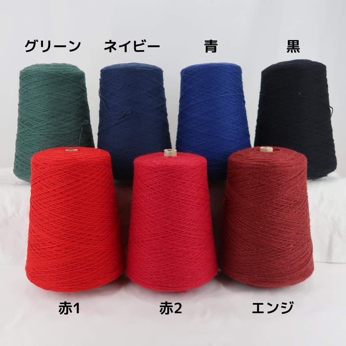 ウール100%、3本撚りのクラフトヤーン。カーペット工場からの残糸、少しボソッとした固めの伸びにくい糸。フリースマットの経糸などにおすすめです。色は赤1、赤2、エンジ、グリーン、ネイビー、青、黒の7色。番手3/7Nm Wool100%