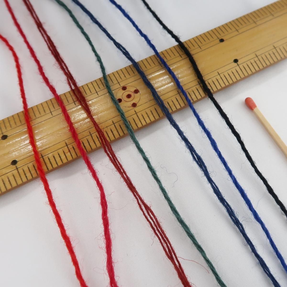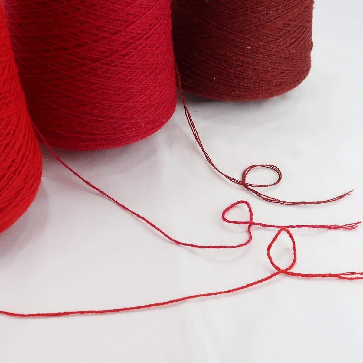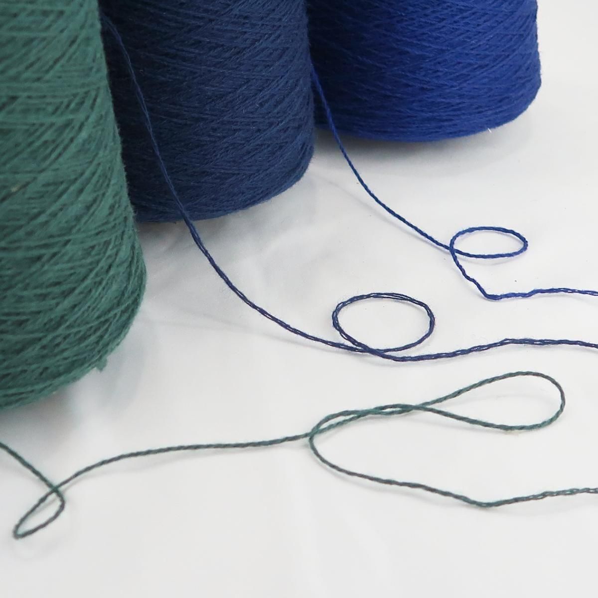 ウール100%、3本撚りのクラフトヤーン。カーペット工場からの残糸、少しボソッとした固めの伸びにくい糸。フリースマットの経糸などにおすすめです。色は赤1、赤2、エンジ、グリーン、ネイビー、青、黒の7色。番手3/7Nm Wool100%